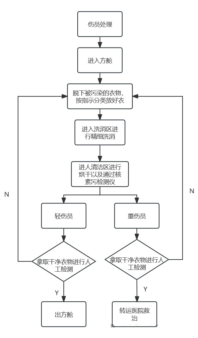 伤员处理->进入核化污染洗消车->脱下被污染的全身衣物->按分类放好衣服物品->在洗消区进行精细洗消->进入清洁区进行烘干跟核污染素检测->(轻伤员拿干净衣服进行检查->出洗消车)->(重伤人员拿干净衣服进行检查->转运到医院救治)