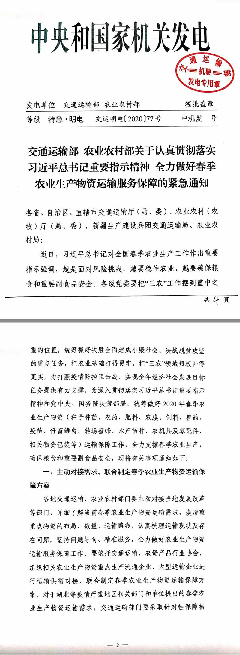 2月26日,交通运输部、农业农村部联合印发紧急通知,要求各地交通运输、农业农村部门认真贯彻落实习近平总书记关于全国春季农业生产工作的重要指示精神,按照党中央、国务院决策部署,统筹做好2020年春季农业生产物资(种子种苗、农药、肥料、农膜、饲料、兽药、疫苗、仔畜雏禽、转场蜜蜂、水产苗种、农机具及零配件、相关物资包装等)运输保障工作,全力支撑春季农业生产,确保粮食和重要副食品安全。