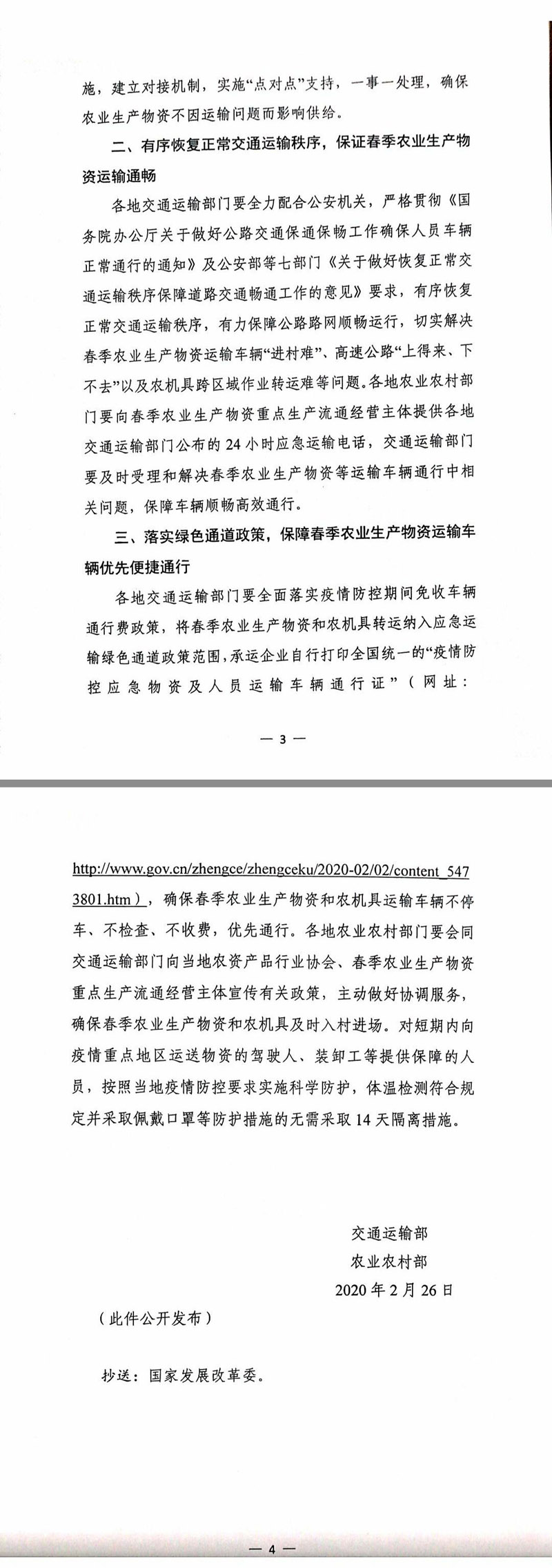 通知还要求,各地交通运输部门要全面落实疫情防控期间免收车辆通行费政策,将春季农业生产物资和农机具转运纳入应急运输绿色通道政策范围,承运企业自行打印全国统一的“疫情防控应急物资及人员运输车辆通行证”,确保物资和农机具运输车辆不停车、不检查、不收费,优先通行。