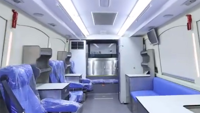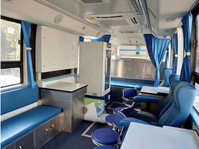 配置锂电池系统的9米长的采血车,取消了传统发动机的供电用锂电池完全代替。可以满足一天8小时的采血工作需求,锂电池放置在下面的行李舱里面。后面这个就是整个的一个电池块。大概有60度的电。内饰进行了升级,包括它的风道,顶棚,包层柱都做了一个商务改造。车厢的布局符合献血流程。采血区域一共有四个采血位,可以四个人同时采血。旁边是登记跟初筛的工作台。负责给采血的人进行登记。检测血型,做简单的初筛。
