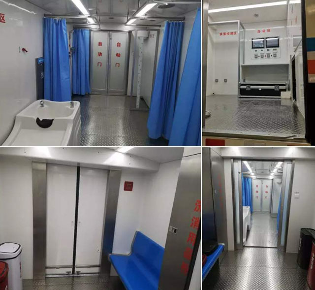 核化污染洗消车就是一座移动的核救治医院。高效移动赶赴现场,去伤病员表面的放射性物质污染。核化污染洗消车分为三个区域,污染区,洗消区,检测区。污染检测区的仪器可以检测身体核污染的量。评估身体被污染水平。污染较轻的应急人员手持表面污染检测仪,精准定位伤病员的污染部位和面积,重点清洗。污染比较重的就需要救护人员帮忙脱掉衣物,洗消区进行精细清洗。洗消好后再到检测区检测洗消后身体辐射量能不能达标。