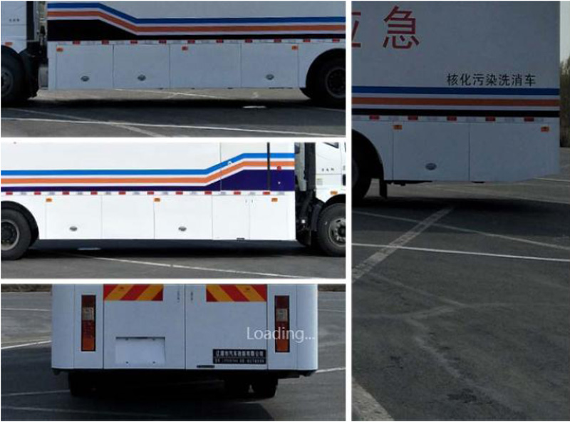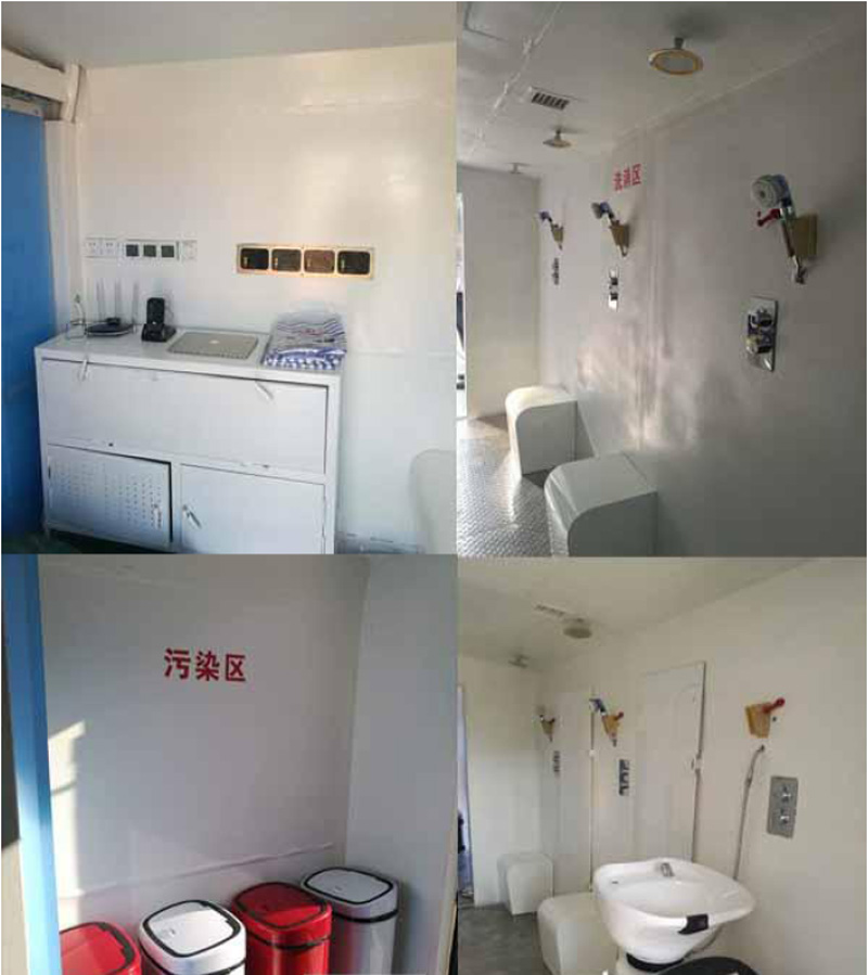 5. 核化污染洗消车洁净区包括全身红外烘干设备、座椅、毛巾柜、衣柜和控制台并设置有照明、空调和新风系统。本发明的积极效果在于:移动展开迅速,可快速抵达突发事件现场开展被污染人员洗消;不仅自带水箱和洗消液箱,功能齐全,布局合理,还可外接水源供水,并可实时补充洗消液,自带的水箱和洗消液可满足125 人次去污洗消具有操作方便、行动快捷、自动化程度高,符合国际医学救援规范和国家标准,符合核化污染人员去污洗消流程和规范;满足应急救援快速需求,洗消车范围设计制造,功能齐全,配备有车辆实时卫星定位、.洗消后放射性水平检测、核素识别功能,功能全;内外光洁、不易沾染、便于去污、可重复多次使用;.它不仅可以快速抵达核化突发事件现场开展被核化污染人员的现场去污洗消,又可停放在核化损伤救治基地和定点医院作为二次洗消用房。是核化突发事件放射性物质或化学物质污染人员去污洗消必配装备。