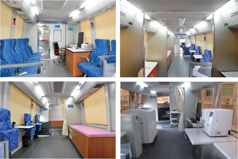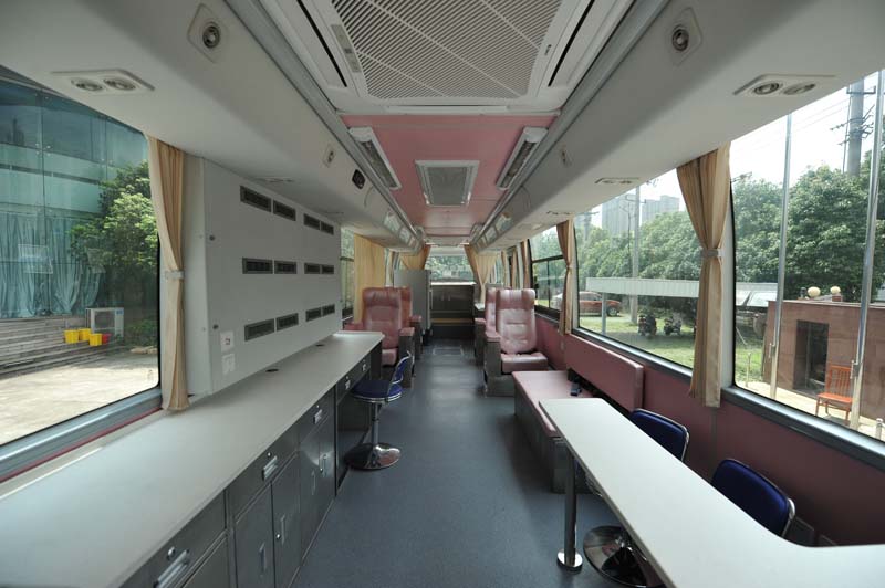 专业的流动献血车征询区、体检区、采血区、休息区布置合理,绿色、环保的特点,实现废气零排放。车内配置了头等舱式献血椅,献血车实际所用到医疗设备一应俱全,总体空间十分宽阔。大部分流动的献血车都有冷暖空调系统、热合机台、医用血液冷藏箱、工作台椅、饮水机、烘手机、配电柜、采血椅、采血台、紫外线消毒灯、 污物桶、灭火器、排风系统等。全车配备先进的平稳支撑系统,配置了网络WIFI,空气净化消毒系统,确保献血活动开展时车内空气的洁净卫生,是一个移动体检中心可用于现场体检和采血。